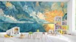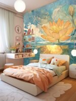 A vibrant orange water lily blooms above water, surrounded by blue waves and soft clouds.