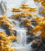 Golden pagodas perched atop cascading waterfalls, surrounded by autumnal trees, create a serene and mystical landscape in a fantastical mountainous setting.