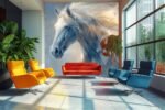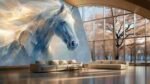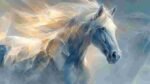 An abstract representation of a white horse with flowing mane and ethereal background colors.