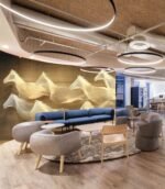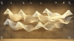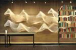 A flowing sculpture of multiple white horses appears to gallop across a wooden wall.