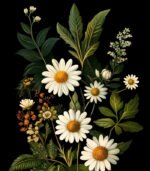 - A vibrant collection of wildflowers and herbs, including daisies and buttercups, artistically arranged against a dark background, highlighting their natural beauty and intricate details.