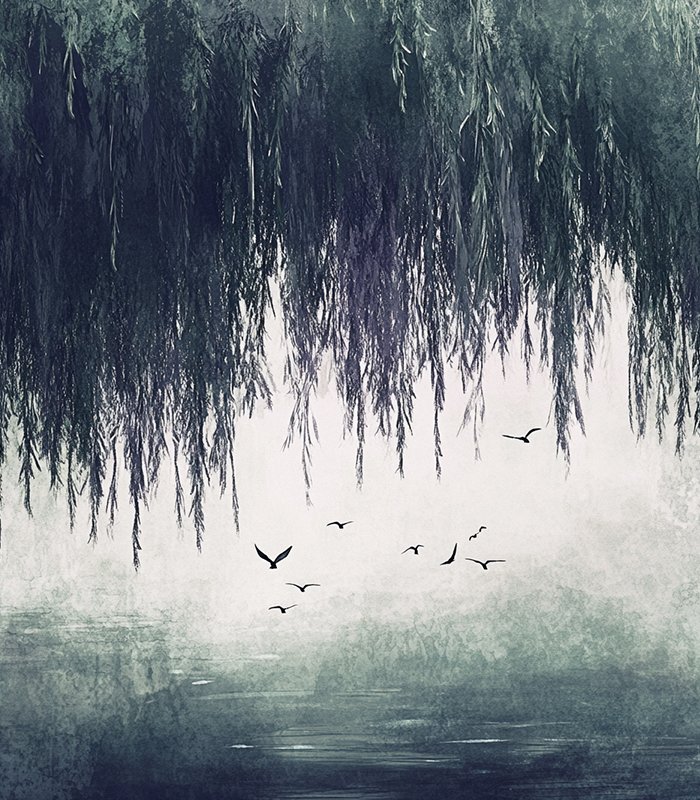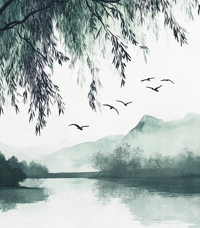 - A serene watercolor illustration of birds flying over a misty lake, framed by delicately hanging willow branches in soothing shades of green.