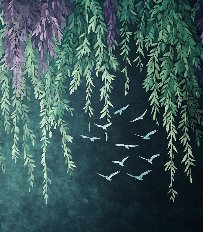 - A serene digital artwork depicting birds flying amidst cascading willow-like branches in a gradient of teal to purple, evoking a tranquil and mystical atmosphere.