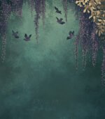 - Birds soar amidst cascading wisteria in a serene, gradient forest, creating a tranquil scene that blends the beauty of flora and fauna harmoniously.