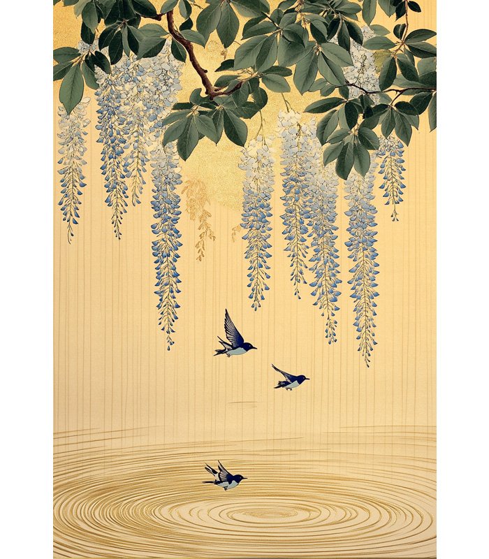 Graceful swallows soar beneath cascading wisteria, creating ripples in a serene pond. A harmonious blend of nature’s elegance and tranquility.