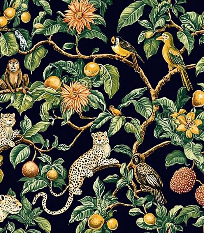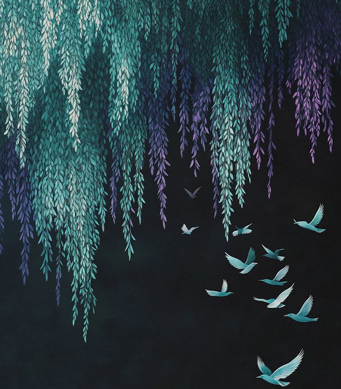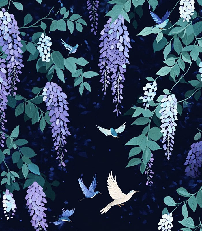 - Three delicate birds in flight amidst cascading wisteria blooms on a rich, dark blue background, creating a serene and enchanting botanical scene.