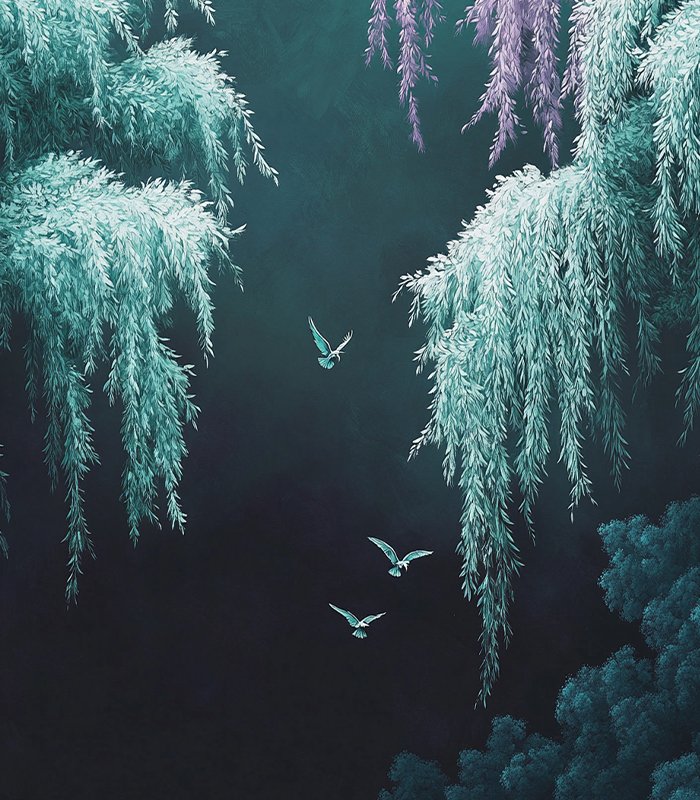 - Birds soar amidst cascading wisteria in a serene, gradient forest, creating a tranquil scene that blends the beauty of flora and fauna harmoniously.