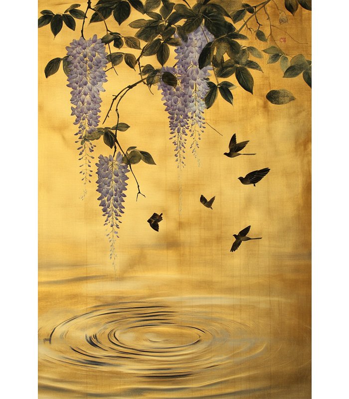Purple wisteria hangs gracefully above a golden background, as birds flutter near rippling water, creating a serene and harmonious scene.