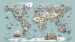 Illustrated world map featuring various animals, landmarks, and scenes from different regions.