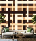 Abstract geometric pattern with intersecting lines and squares in shades of brown and beige, creating a woven, grid-like visual effect.