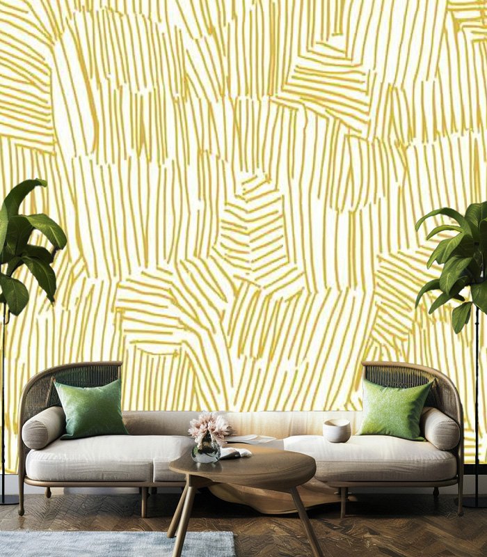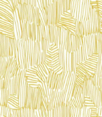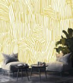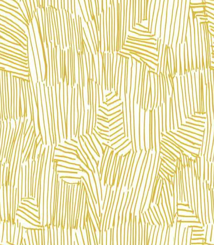 Abstract pattern of yellow lines on white background, creating a dynamic, textured design with irregular, overlapping shapes and a sense of movement.