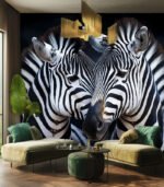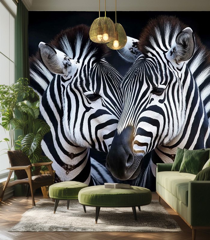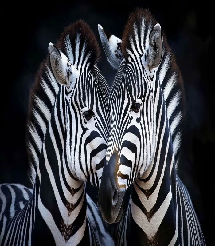 Two zebras stand closely together, their striking black and white stripes creating a mesmerizing pattern against a dark background, showcasing nature’s artistry.