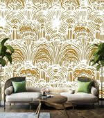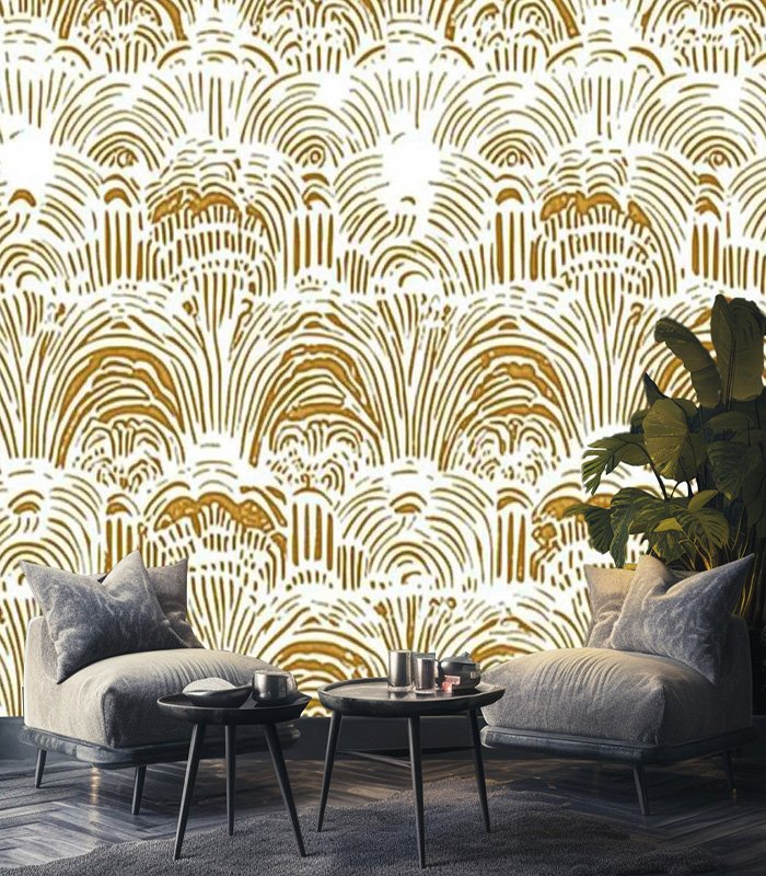 Intricate gold and white pattern featuring stylized, repeating wave-like designs, creating a harmonious and elegant visual reminiscent of traditional Japanese art.